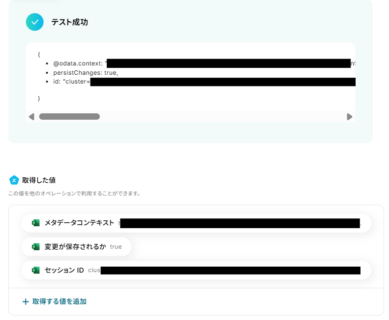 設定し終わったらテストボタンをクリックしましょう。 テストが成功し、取得した値が入ります。