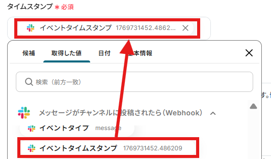 「タイムスタンプ」は、ステップ3で設定したメッセージのイベントタイムスタンプを選びましょう。