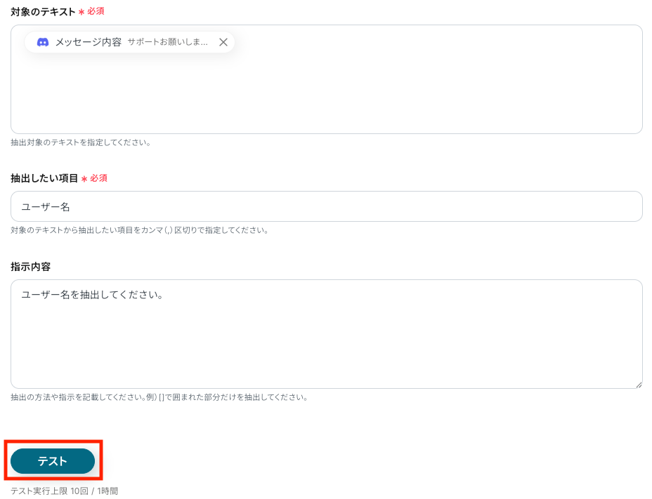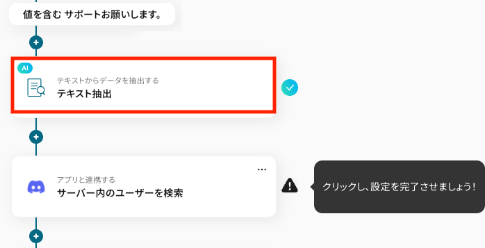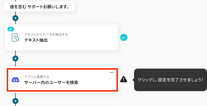 この設定により、Discordで「サポートお願いします。」という文言を含むメッセージが送信された場合のみ、後続の処理が実行されます。