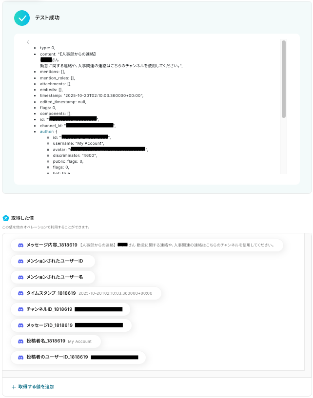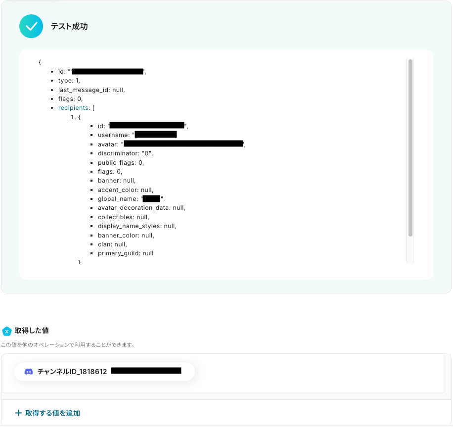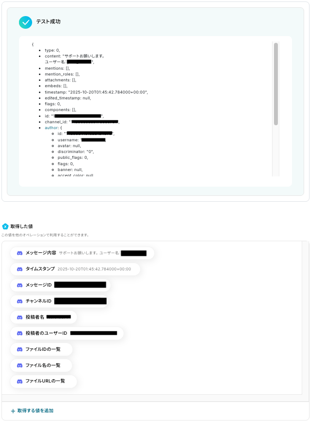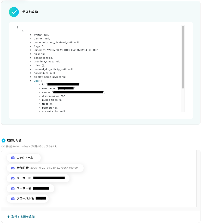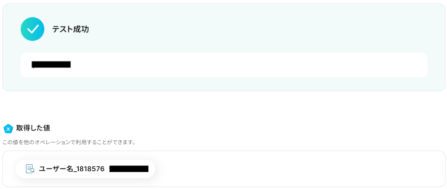 テストに成功すると、以下のように「取得した値」が表示されます。