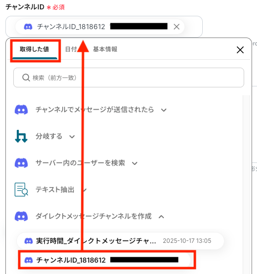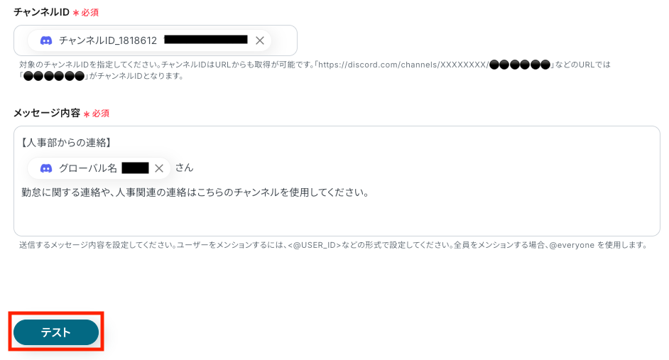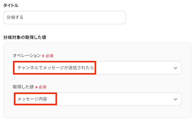 - タイトル:自由に名前を変更できます。設定したタイトルは、上記画像の赤枠内「チャンネルでメッセージが送信されたら」に反映されます。