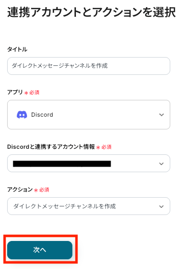 - アカウント情報:ステップ1で連携したアカウントが自動で選択されています。必要に応じて、他のアカウントに切り替えることも可能です。