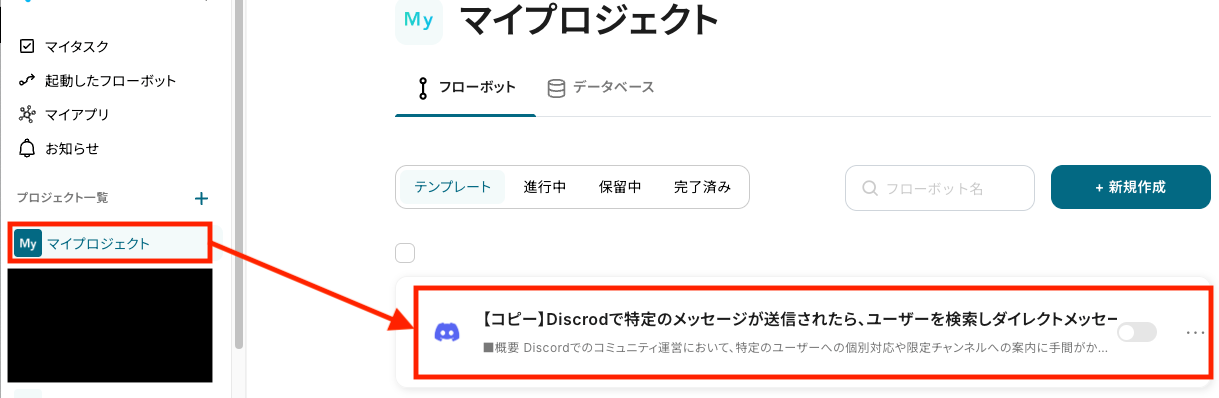 はじめにマイプロジェクトから、「【コピー】Discordで特定のメッセージが送信されたら、ユーザーを検索しダイレクトメッセージチャンネルを作成する」を選んでください。