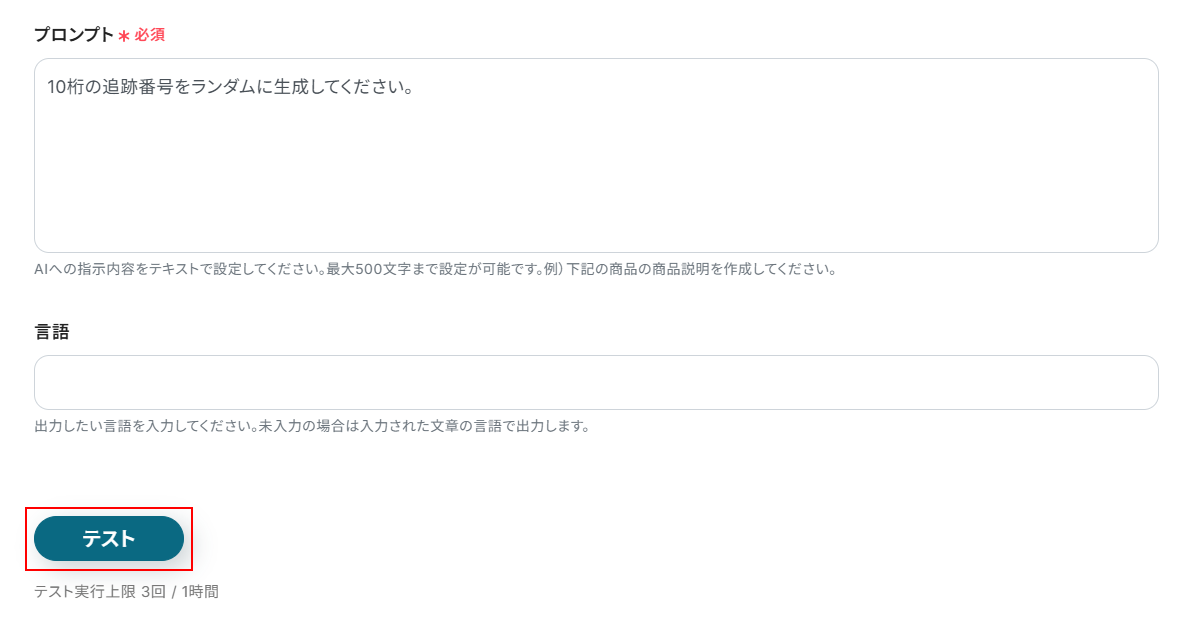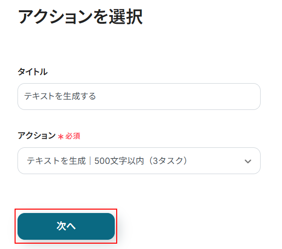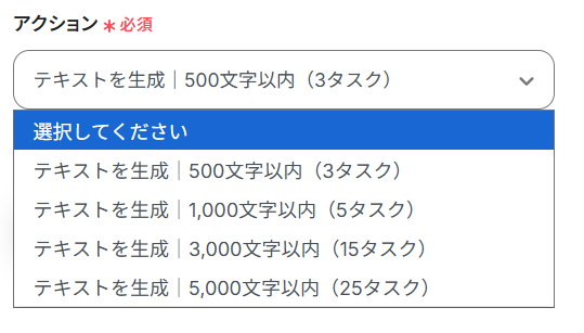 そのため、アクションに設定されているデフォルトで最小の設定である500文字以内(3タスク)をそのまま使用します。