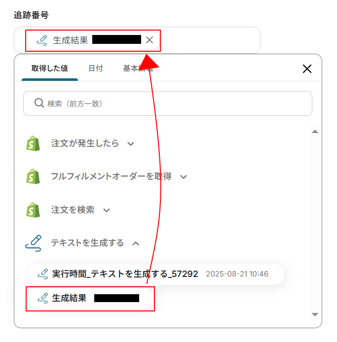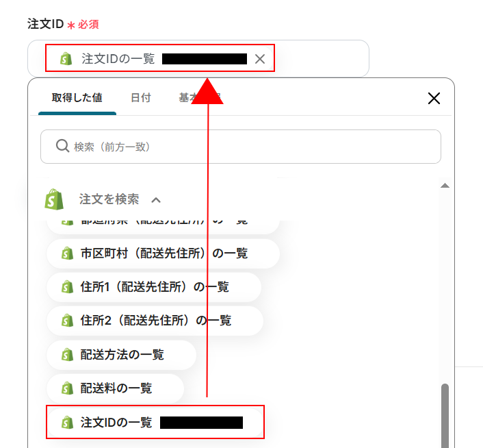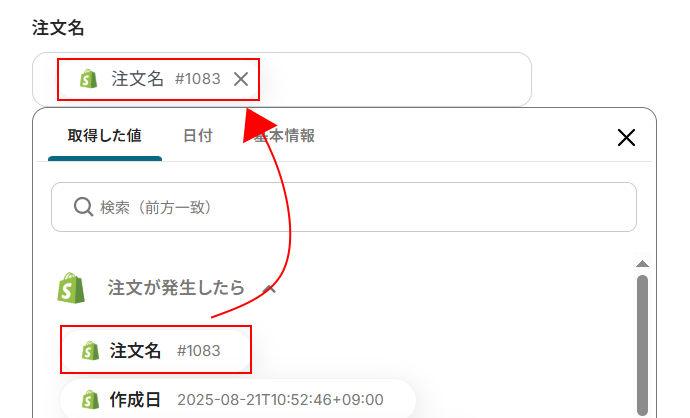 デフォルトで設定されているため今回は変更を行いませんが、下記のように入力欄をクリックして取得した値から選択することも可能です。