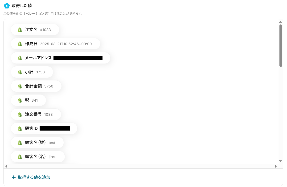 テストに成功するとテスト成功画面が表示され、下記のように取得した値(アウトプット)が表示されます。
