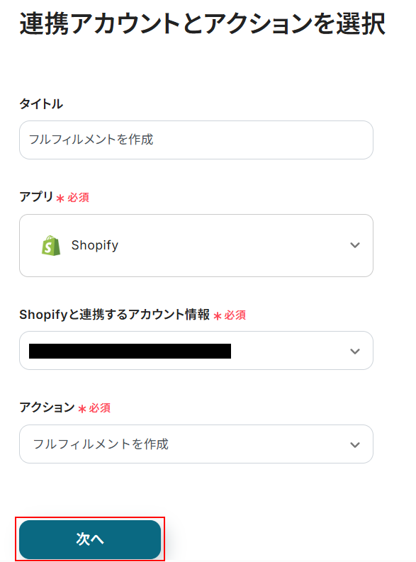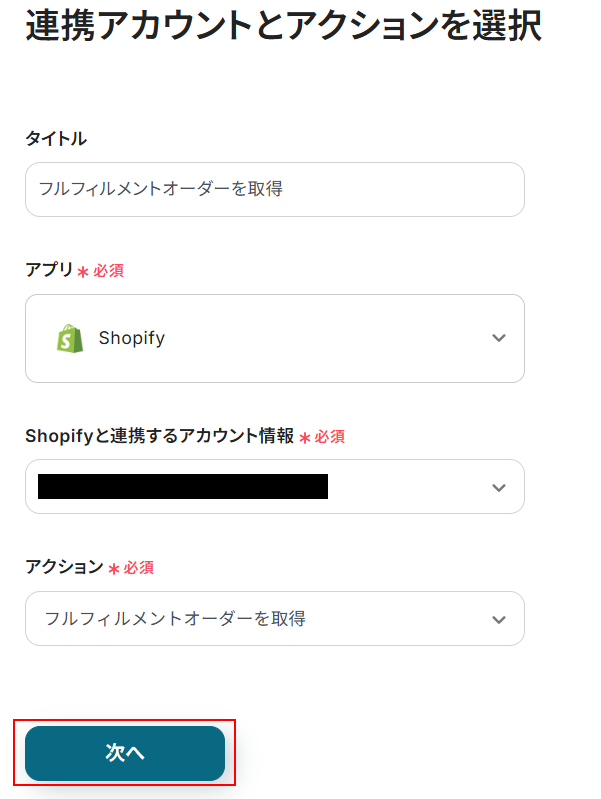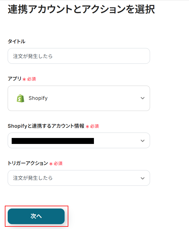 Shopifyと連携するアカウント情報には、ステップ1で登録したアカウントが表示されています。