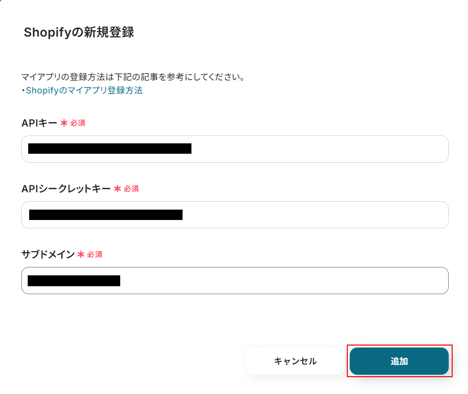 APIキー、APIシークレットキー、サブドメインを入力し「追加」をクリックします。