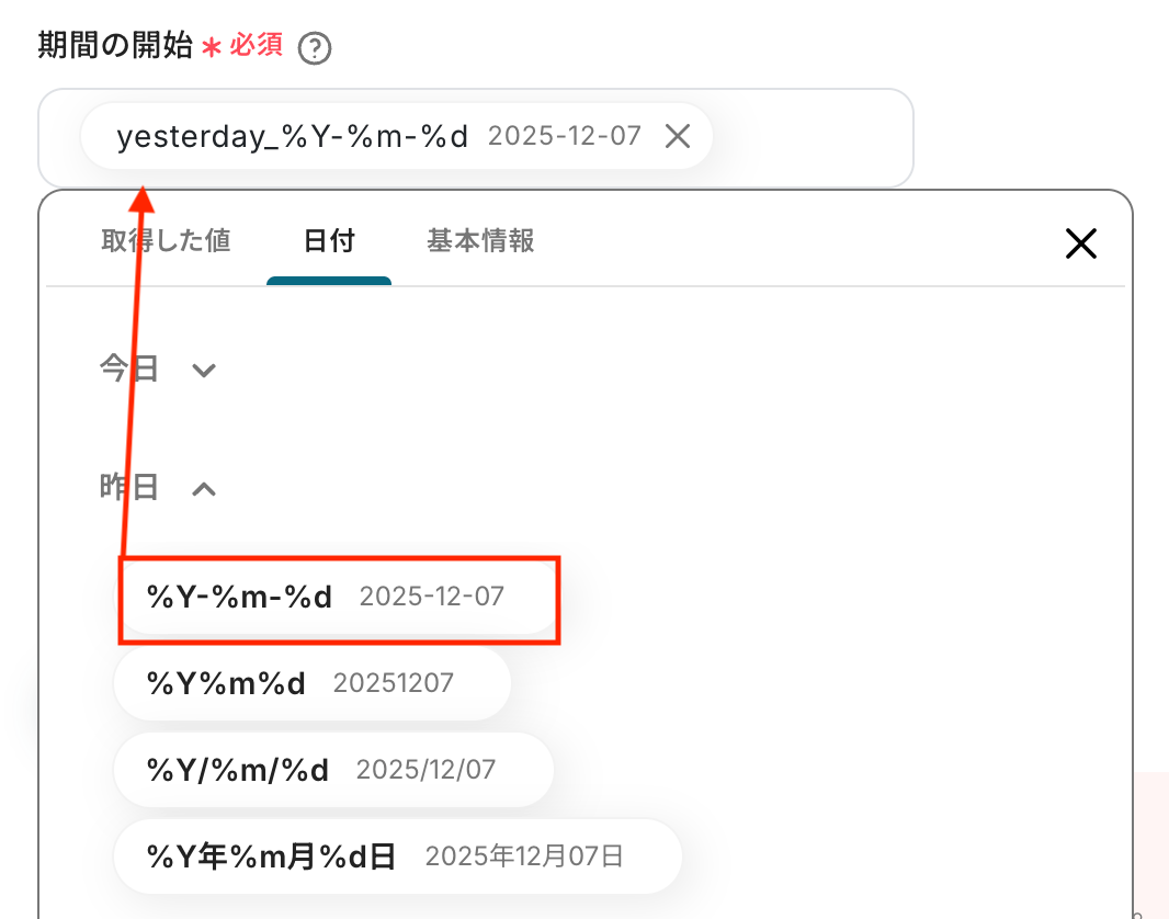 期間の開始、期間の終わり アカウントレポートを取得する期間の開始と終わりを設定しましょう。 入力欄をクリックすると日付タブが表示されるので、そこから選択して入力しましょう。 入力が完了したら「テスト」をクリックして、設定した内容でアカウントレポートが正しく取得されるか確認しましょう。