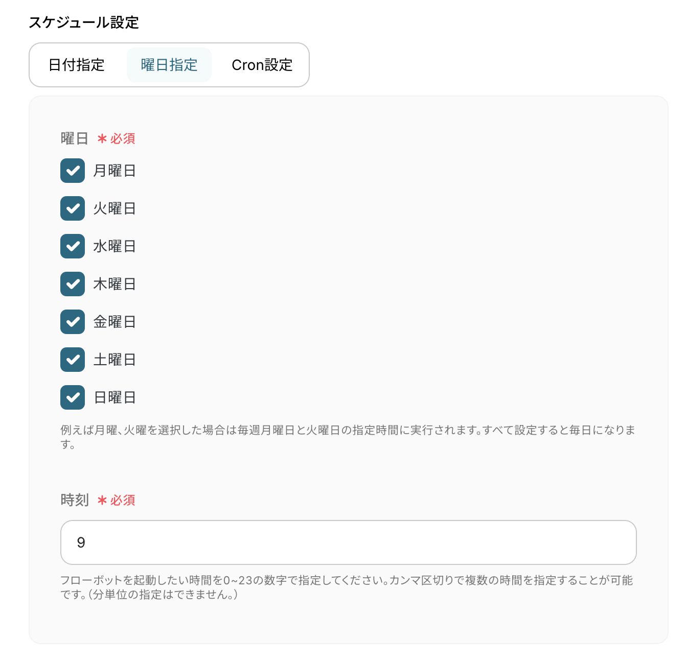 今回は、毎日朝9時にフローボットを実行するよう以下のスケジュールを設定しています。