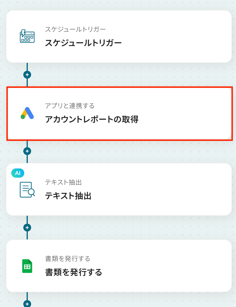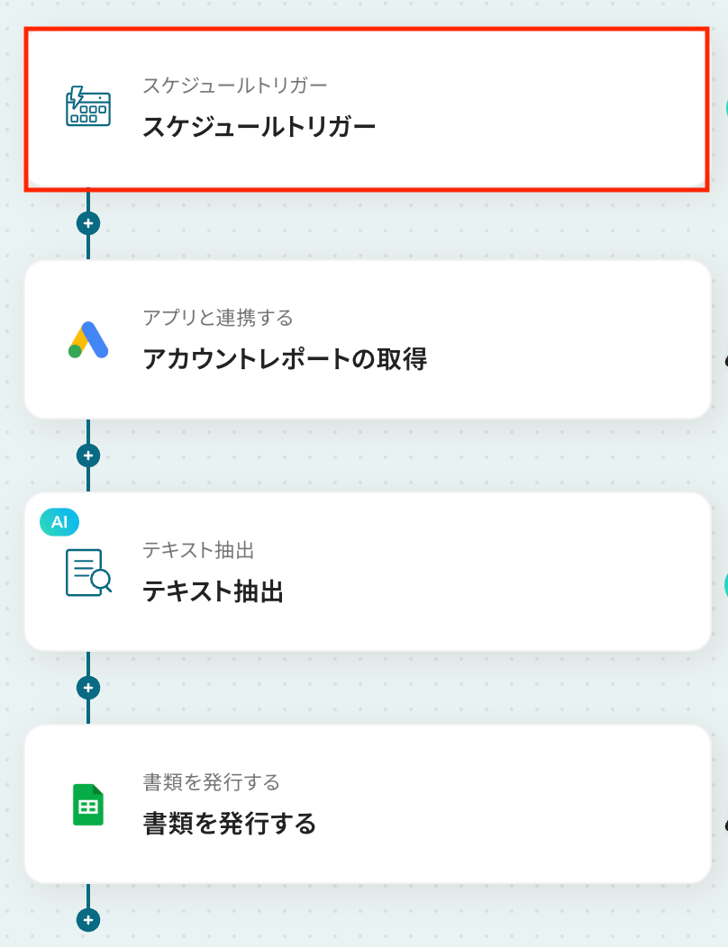 スケジュールトリガー機能では、レポートを取得したい日時(毎日、毎月など)を任意で設定してください。 Google Adsのアクションでは、レポートを取得する対象の広告アカウントIDや、取得したいデータの期間を任意で設定できます。 AI機能によるテキスト抽出では、取得したレポート情報からどの項目を抽出するかを自由にカスタマイズできます。 書類発行機能では、あらかじめ用意したGoogle スプレッドシートの雛形を指定し、どのセルにどの情報を反映させるかなどを任意で設定可能です。 ■注意事項