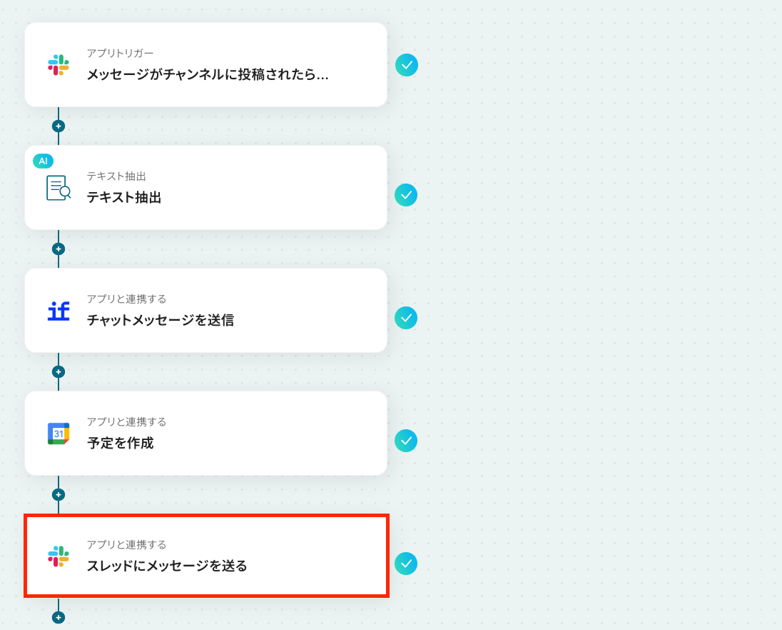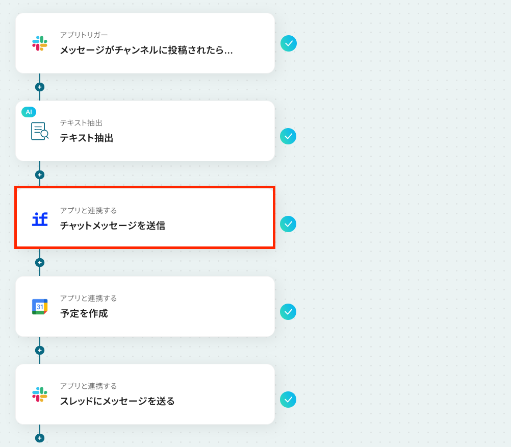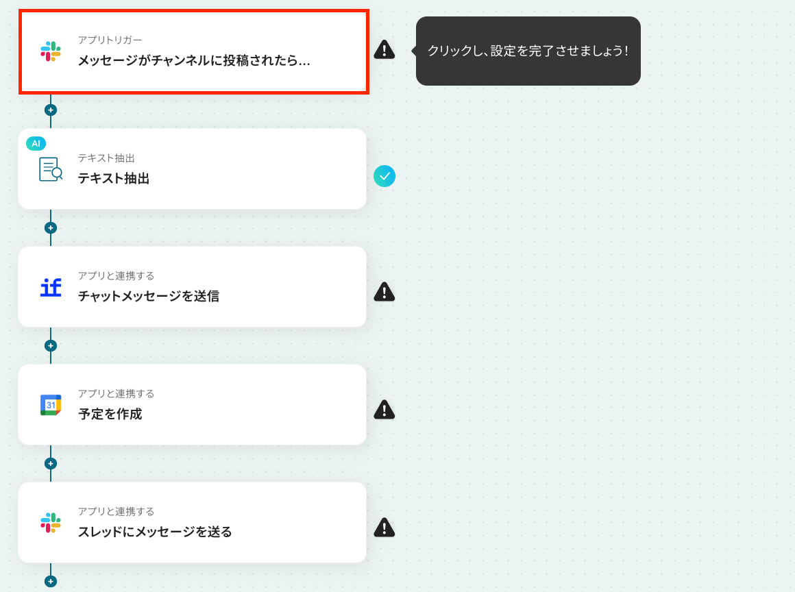 これから「Slackでメッセージが送信されたら、Difyのチャットボットで解析しGoogleカレンダーにイベントを作成する」フローを設定していきます。