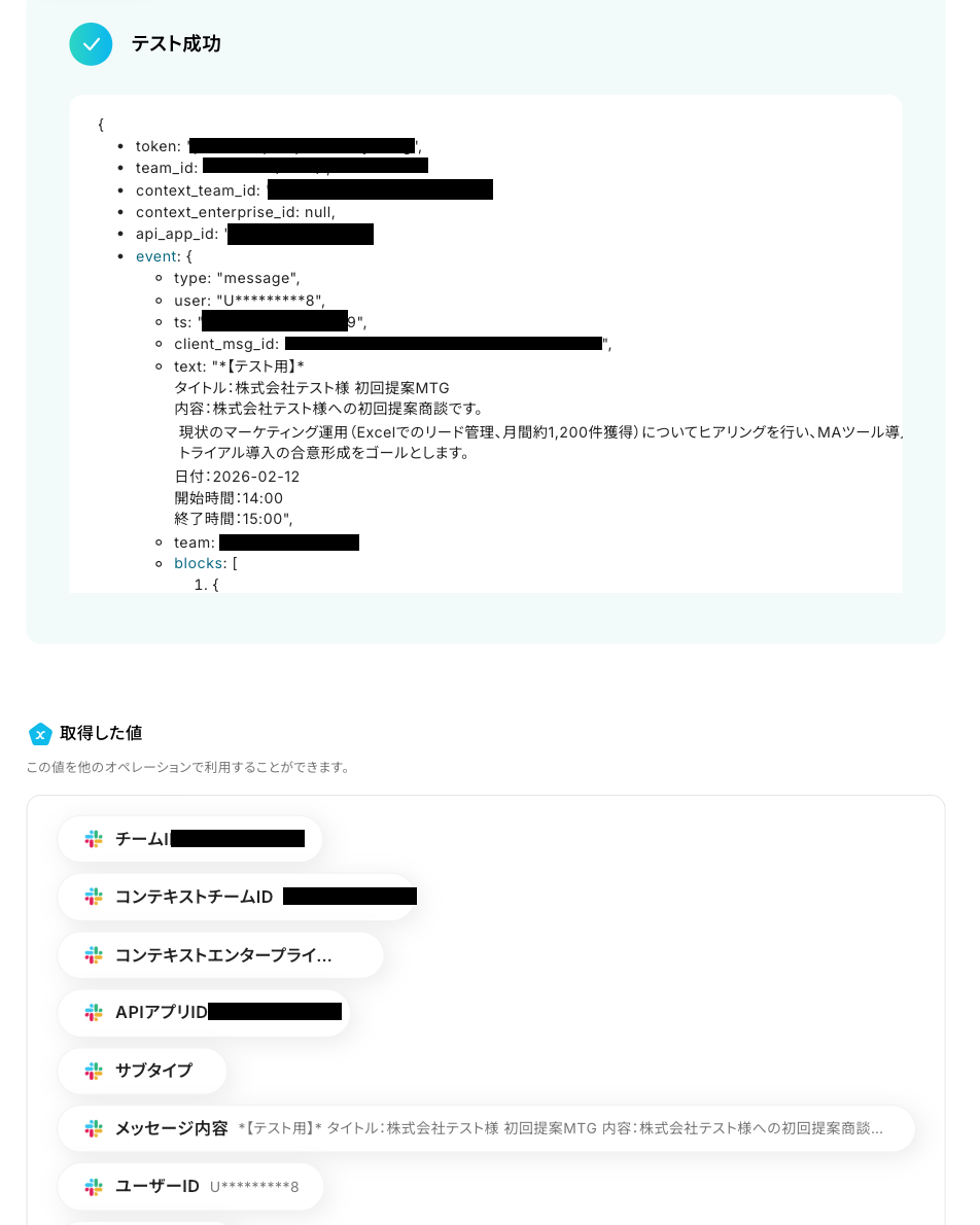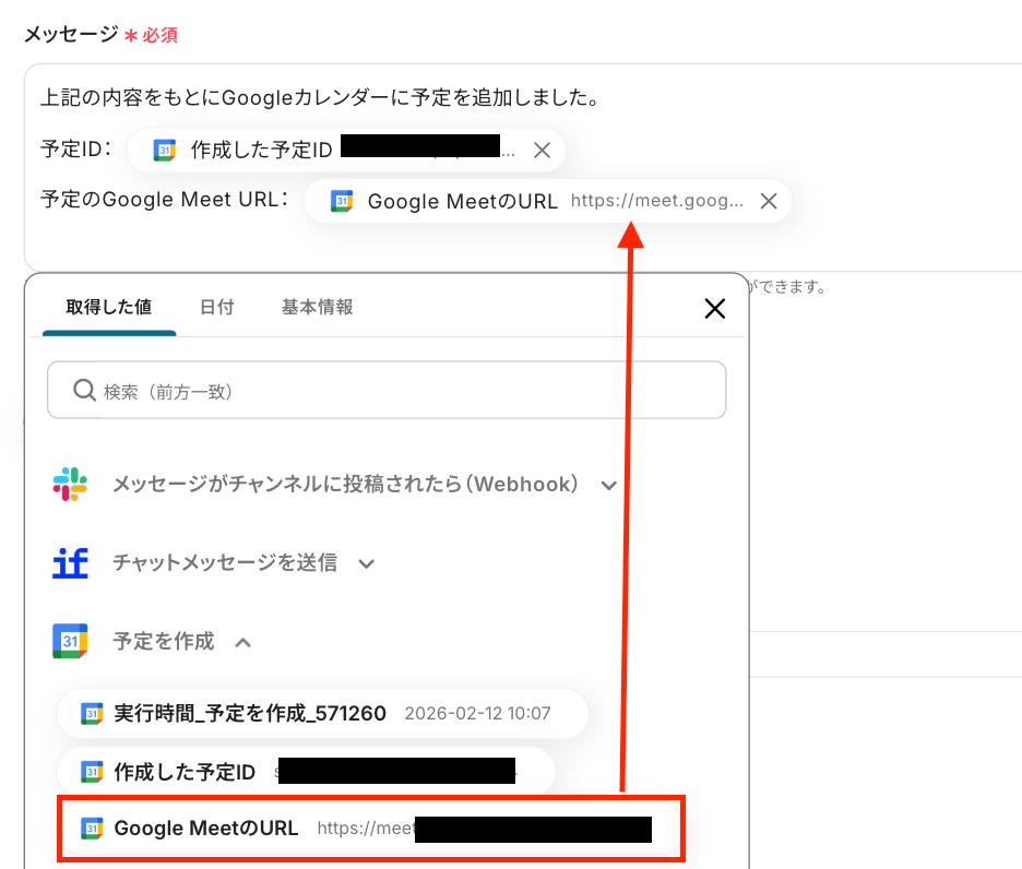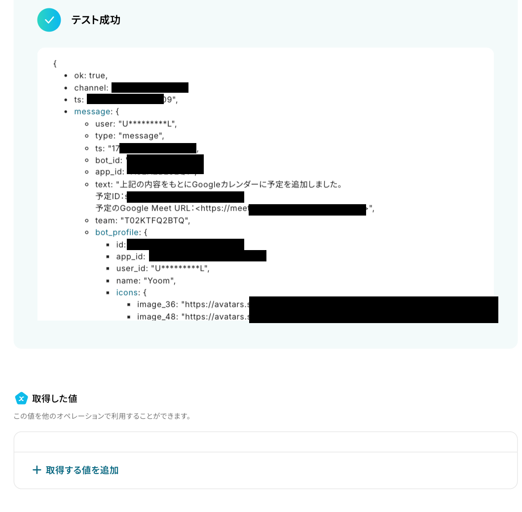 - Slackへの完了通知では、本文を自由に編集できます。例えば、作成されたGoogleカレンダーのイベントURLを変数として本文に埋め込むことで、通知から直接予定を確認できるようになります。