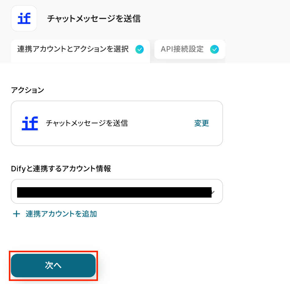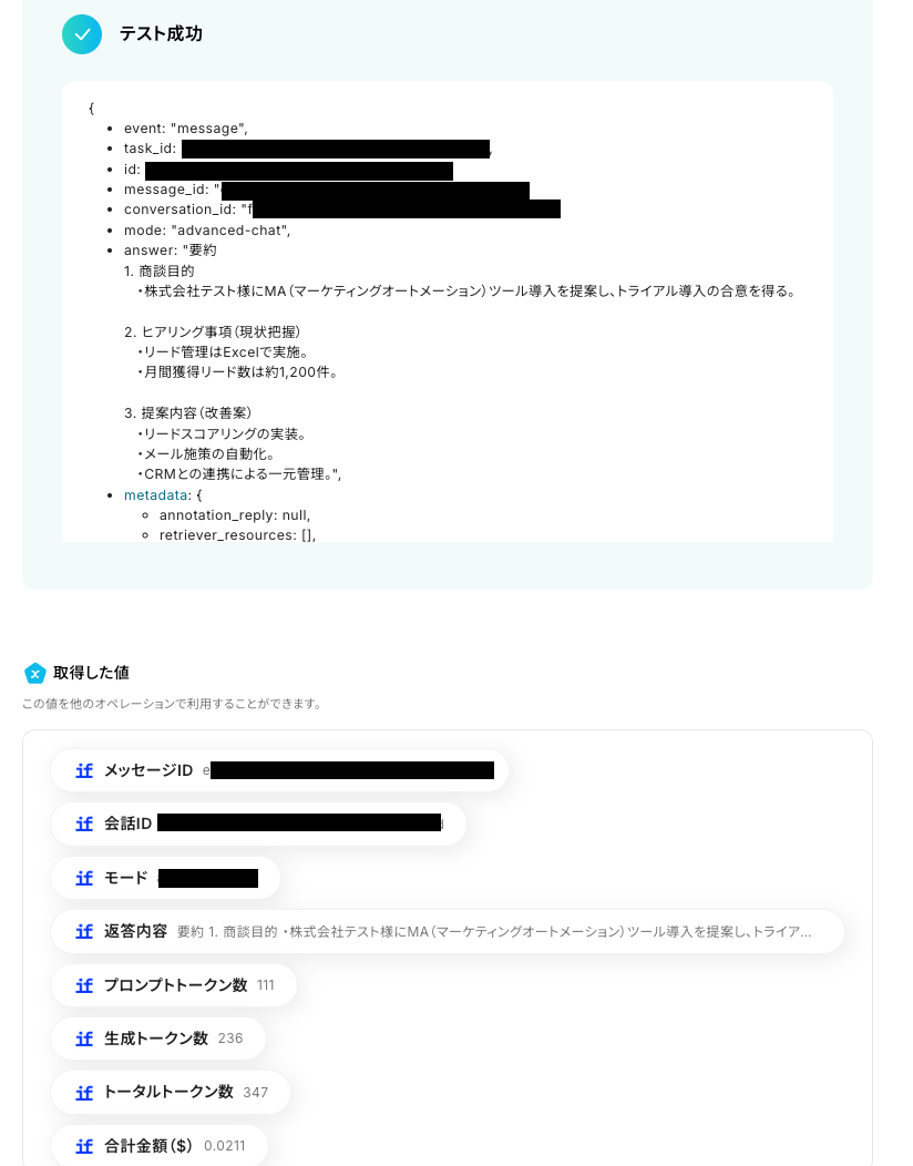 - 次に、オペレーションでDifyの「チャットメッセージを送信」を設定し、抽出した情報を解析させる