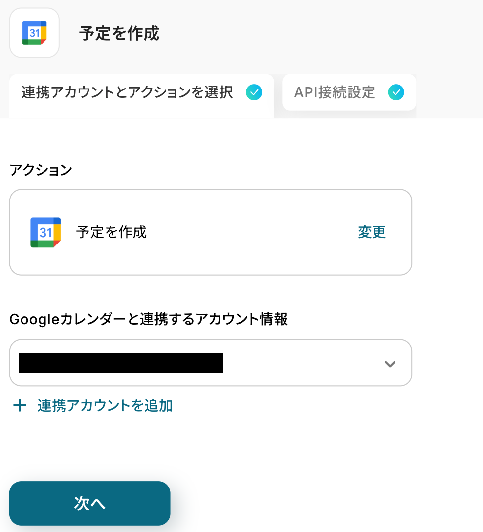 - 最後に、オペレーションでGoogleカレンダーの「予定を作成」を選択し、抽出した情報を紐付けて予定が自動で作成されるように設定します。