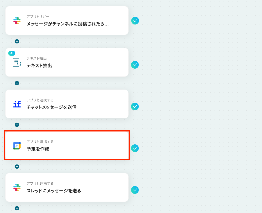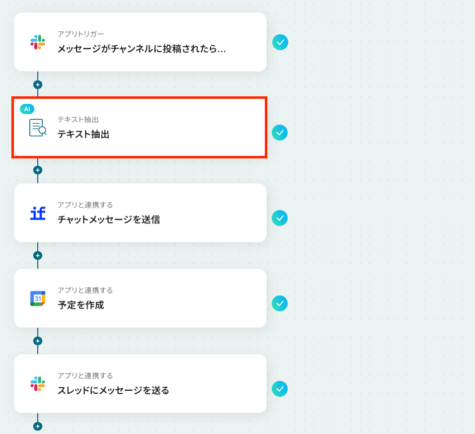 それではここから代表的な例として、Slackで特定のメッセージが送信されたら、その内容をAIが解析し、Googleカレンダーにイベントを自動で作成するフローを解説していきます!