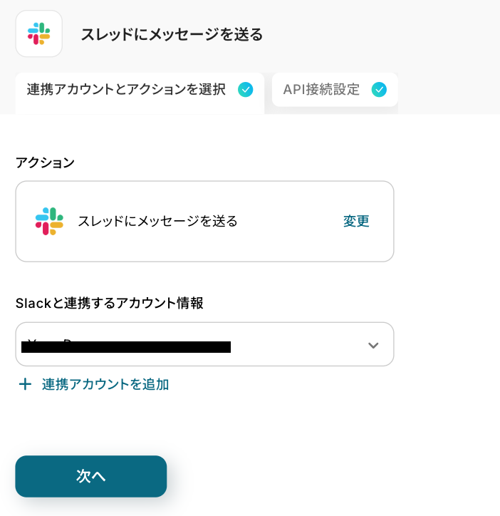 - 最後に、オペレーションでSlackの「スレッドにメッセージを送る」を設定し、イベント作成完了を通知する
