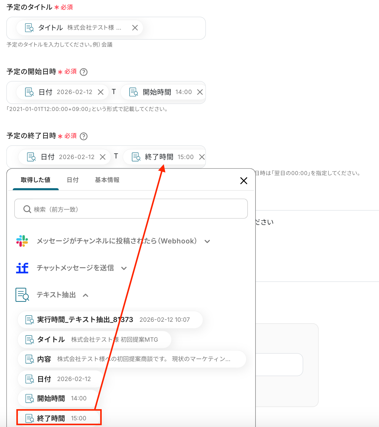 - 最後に、オペレーションでGoogleカレンダーの「予定を作成」アクションを設定し、抽出した情報を元に新しい予定を登録します。