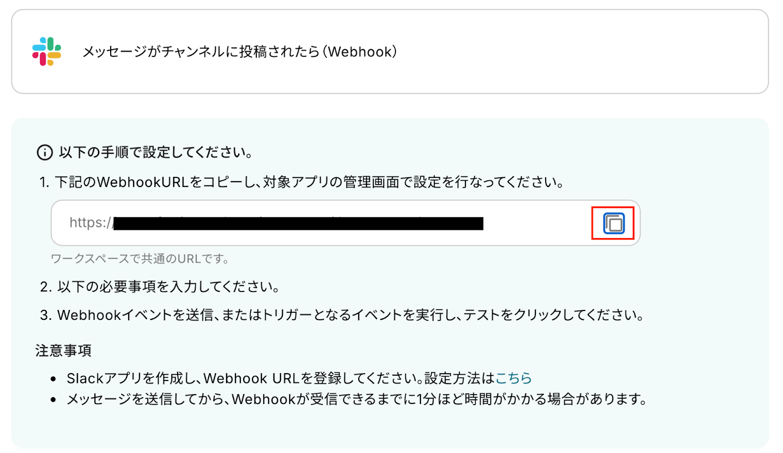 次の画面で、手順を参照し、Webhookの受信設定を行います。