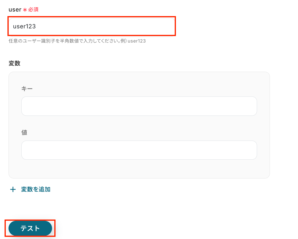 「指示内容」を任意で設定し、テストをクリックしてください。