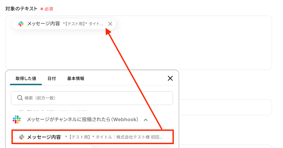 ここでは、Slackのメッセージテキストを抽出する設定を行います。