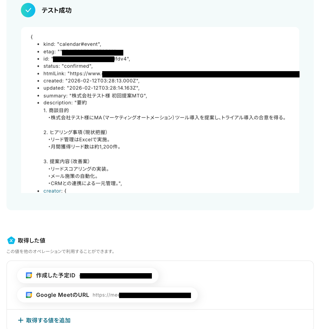 - Googleカレンダーに予定を作成するオペレーションでは、予定のタイトル、日時、説明文、参加者などの各項目に、固定値や前段で取得した情報を自由に割り当てることが可能です。
