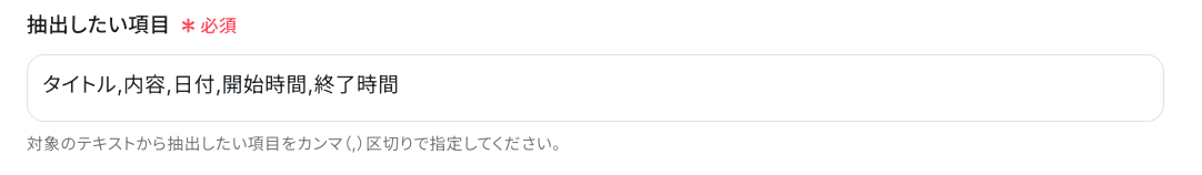 - AI機能の設定で、メッセージ本文からどのような情報を抽出するか(例:件名、開始日時、終了日時など)を任意で指定してください。