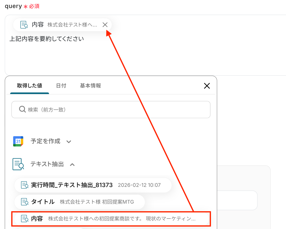 「query」は、テキスト抽出設定で取得した値を引用して設定します。