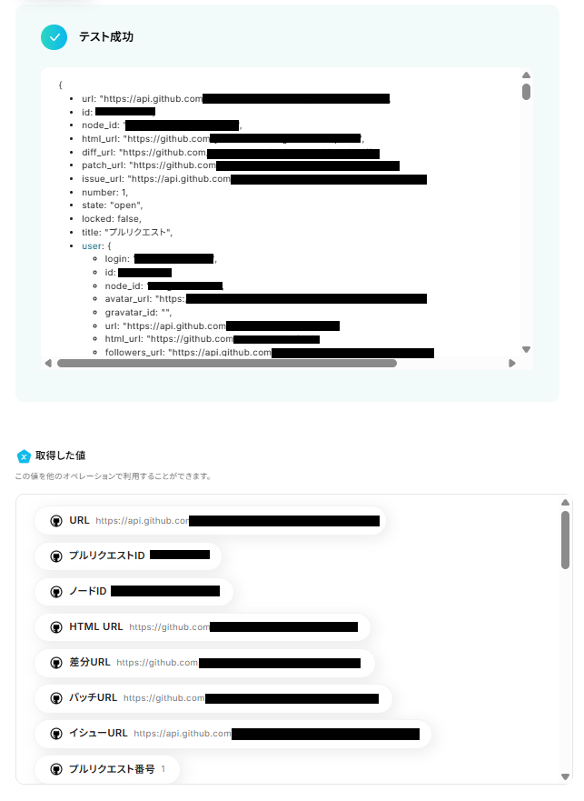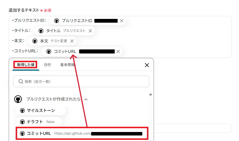 「タイトル」や「本文」といった基本情報に加え、「URL」「プルリクエストID」「更新日時」など、様々な項目を取得できます。