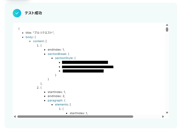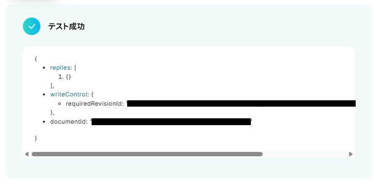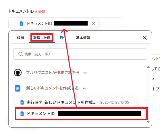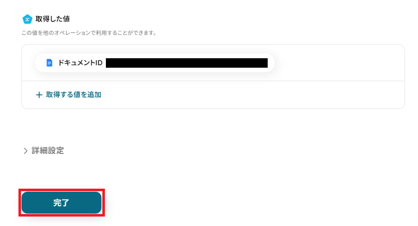「ドキュメントID」は、前ステップで作成したGoogleドキュメントのIDを、取得した値から引用し設定しましょう。