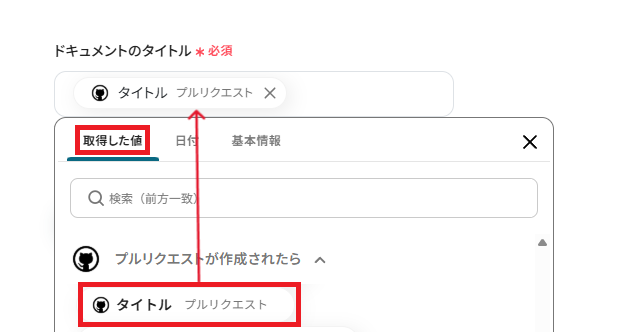 「ドキュメントのタイトル」は、任意で設定できますが、取得した値を活用することで固定値ではなく、トリガーが実行されるたびに最新の情報が反映できます。