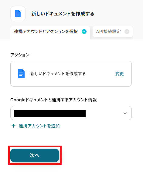 - 次に、オペレーションでGoogleドキュメントの「新しいドキュメントを作成する」アクションを設定し、新規ドキュメントを作成します