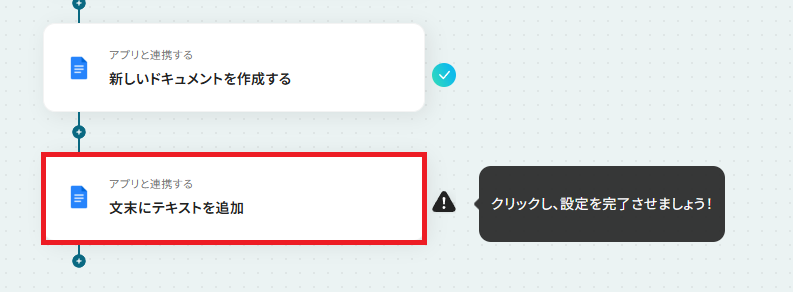 - 最後に、オペレーションでGoogleドキュメントの「文末にテキストを追加」アクションを設定し、前段で作成したドキュメントに情報を追記します。