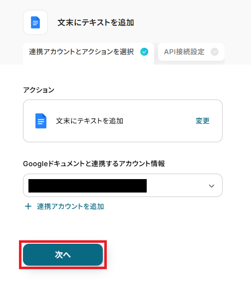 再度、Yoomと連携するGoogleドキュメントのアカウントに間違いがないかを確認し「次へ」をクリックしましょう。