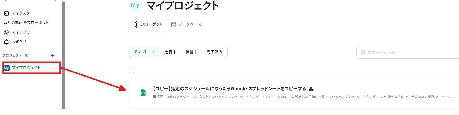 また、コピーしたテンプレートはマイプロジェクトに保存されているので、マイプロジェクトからも開くことができます。