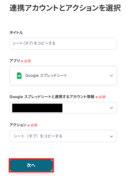 ステップ4:シート(タブ)をコピーするアクションを設定