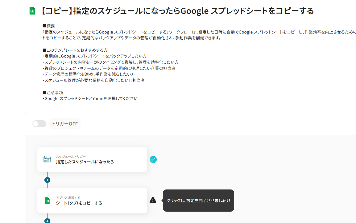 YoomにはGoogle スプレッドシートを自動でコピーする業務フロー自動化のテンプレートが用意されています。