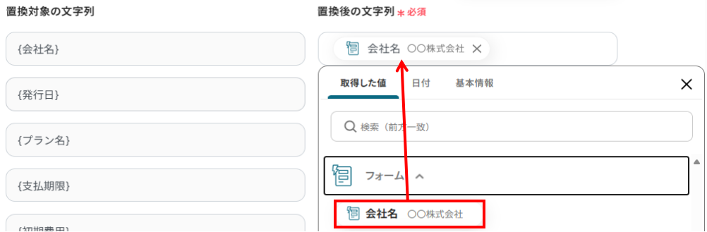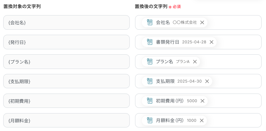 下図のようにそれぞれの入力欄をクリックするとアウトプットが表示されるので、「置換後の文字列」に適切な値を設定してください。