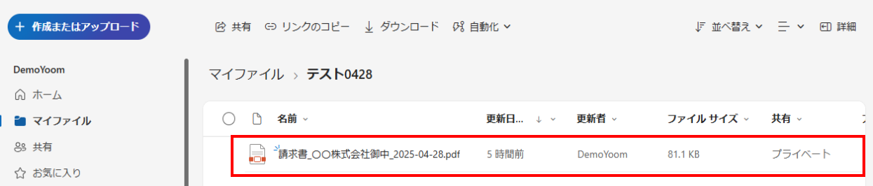 テストが成功すると、指定したOneDriveのフォルダに、自動作成した請求書がアップロードされているはずなので、確認してみましょう。