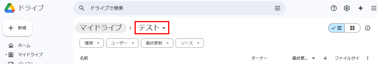 今回は、下図赤枠のようなテスト用フォルダを用意しました。
