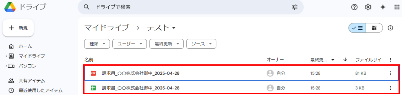 指定したGoogle Driveのフォルダに、設定したファイル名でGoogleドキュメントファイルとPDFファイルが格納されていることも確認してみましょう。