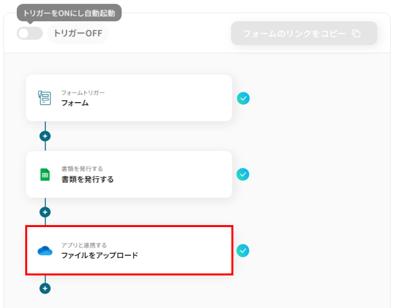 最後に、OneDriveに自動作成した書類をアップロードする設定です。