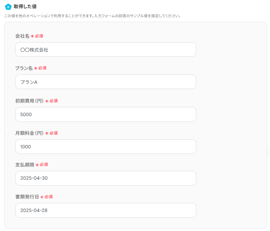 ※ここでは「取得した値」を手入力していますが、実際にフローを稼働させてフォームの運用を開始した際には、フォームの回答データが「取得した値」にアウトプットとして反映されます。