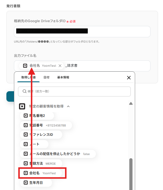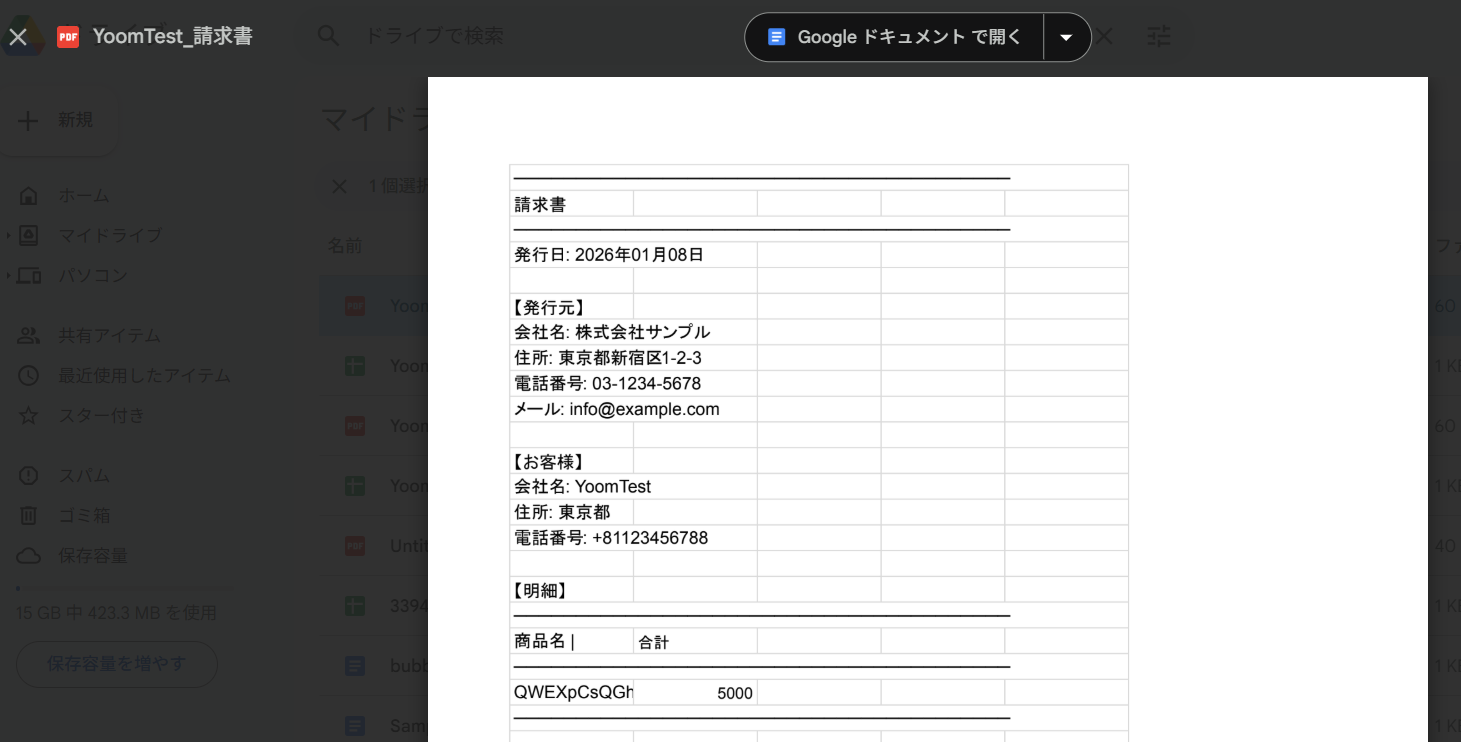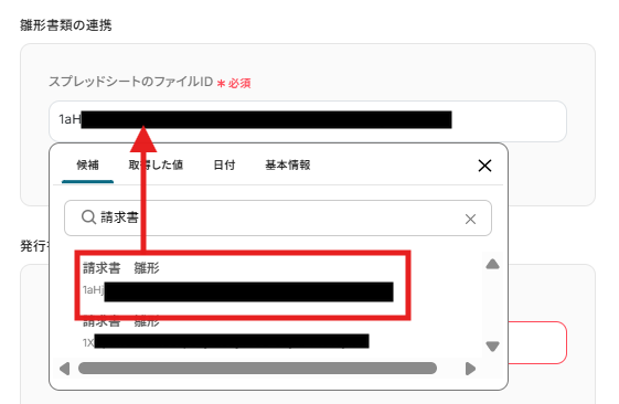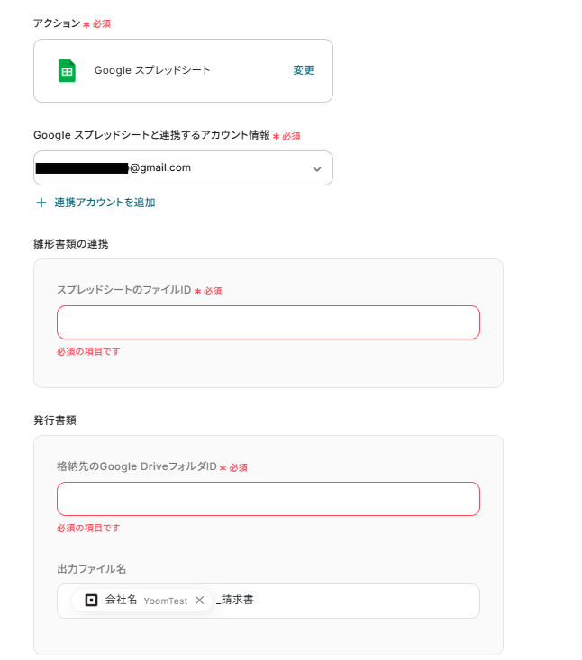 - Google スプレッドシートで書類を発行するアクションでは、請求書の雛形として利用するスプレッドシートのファイルIDを任意で設定してください