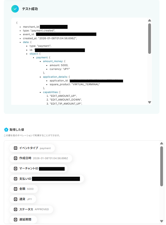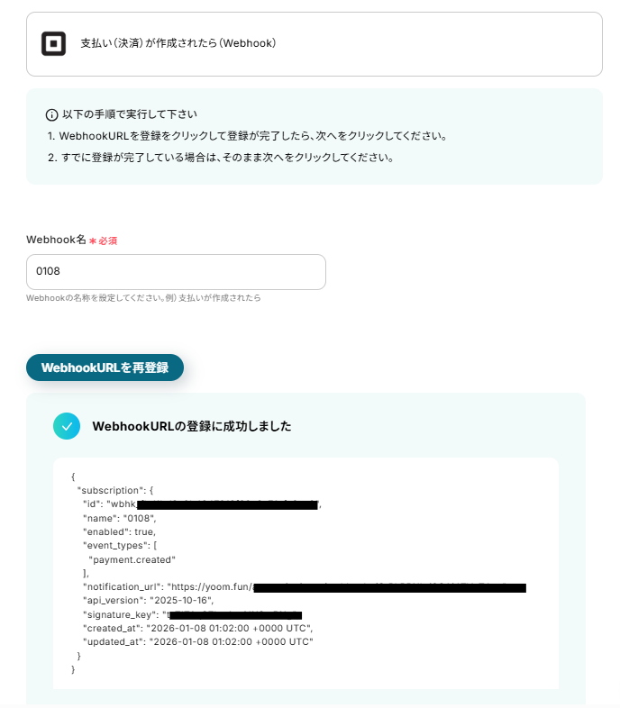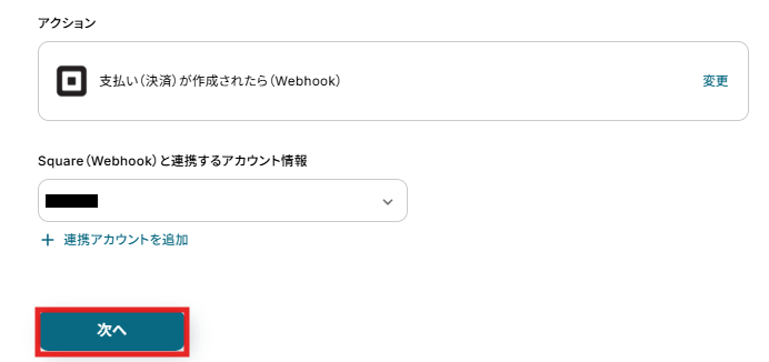 - Squareのトリガー設定では、任意のWebhook名を設定することが可能です