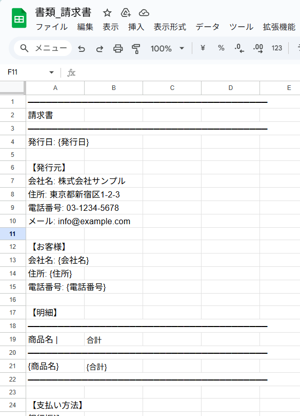 このフローではSquareで支払いが作成されたら、経理提出用の正式な請求書を自動発行してユーザーへ送付する業務フローを想定しています。そのため、事前にGoogle スプレッドシートで請求書の雛形を作成する必要があります。今回は以下のように作成しました。