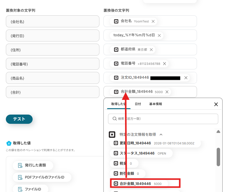 入力できたら、「テスト」をクリック。