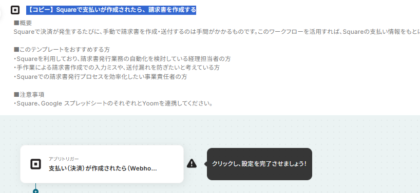 それではここから代表的な例として、Squareで支払いが作成された際に、請求書を自動で作成するフローを解説していきます。