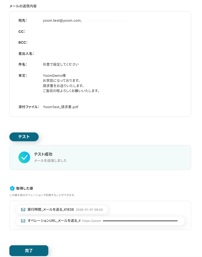 - 最後に、オペレーションでメール機能の「メールを送る」アクションを設定し、作成した請求書を添付して顧客に自動で送信します