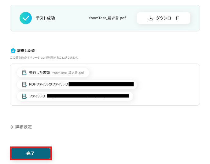 テストが成功し、取得した値を確認したら、「完了」をクリックします。